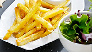 1. Des frites surgelées à cuire au four 2. Des frites surgelées à frire dans un bain d'huile. Conseil : outre les frites, testez également d'autres variétés de pommes de terre surgelées. Remarque : n'oubliez pas que les frites surgelées sont toutes différentes. Les différentes marques et variétés requièrent des réglages différents. Vous trouverez des indications sur les temps de cuisson dans le mode d'emploi et le guide de démarrage rapide. Si vos frites surgelées ne sont pas comme vous l'espériez, consultez la FAQ « Mes aliments ne sont pas aussi croustillants que je l'espérais. Comment faire ? ».
